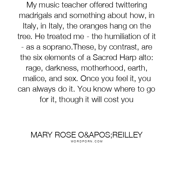 My music teacher offered twittering madrigals and something about how, in Italy, in Italy, the oranges hang on the tree. He treated me - the humiliation of it - as a soprano.These, by contrast, are the six elements of a Sacred Harp alto: rage, darkness, motherhood, earth, malice, and sex. Once you feel it, you can always do it. You know where to go for it, though it will cost you