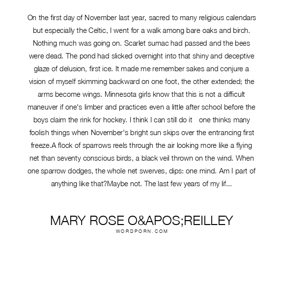On the first day of November last year, sacred to many religious calendars but especially the Celtic, I went for a walk among bare oaks and birch. Nothing much was going on. Scarlet sumac had passed and the bees were dead. The pond had slicked overnight into that shiny and deceptive glaze of delusion, first ice. It made me remember sakes and conjure a vision of myself skimming backward on one foot, the other extended; the arms become wings. Minnesota girls know that this is not a difficult maneuver if one's limber and practices even a little after school before the boys claim the rink for hockey. I think I can still do it - one thinks many foolish things when November's bright sun skips over the entrancing first freeze.A flock of sparrows reels through the air looking more like a flying net than seventy conscious birds, a black veil thrown on the wind. When one sparrow dodges, the whole net swerves, dips: one mind. Am I part of anything like that?Maybe not. The last few years of my life have been characterized by stripping away, one by one, loves and communities that sustain the soul. A young colleague, new to my English department, recently asked me who I hang around with at school. "Nobody," I had to say, feeling briefly ashamed. This solitude is one of the surprises of middle age, especially if one's youth has been rich in love and friendship and children. If you do your job right, children leave home; few communities can stand an individual's most pitiful, amateur truth telling. So the soul must stand in her own meager feathers and learn to fly - or simply take hopeful jumps into the wind.In the Christian calendar, November 1 is the Feast of All Saints, a day honoring not only those who are known and recognized as enlightened souls, but more especially the unknowns, saints who walk beside us unrecognized down the millennia. In Buddhism, we honor the bodhisattvas - saints - who refuse enlightenment and return willingly to the wheel of karma to help other beings. Similarly, in Judaism, anonymous holy men pray the world from its well-merited destruction. We never know who is walking beside us, who is our spiritual teacher. That one - who annoys you so - pretends for a day that he's the one, your personal Obi Wan Kenobi. The first of November is a splendid, subversive holiday.Imagine a hectic procession of revelers - the half-mad bag lady; a mumbling, scarred janitor whose ravaged face made the children turn away; the austere, unsmiling mother superior who seemed with great focus and clarity to do harm; a haunted music teacher, survivor of Auschwitz. I bring them before my mind's eye, these old firends of my soul, awakening to dance their day. Crazy saints; but who knows what was home in the heart? This is the feast of those who tried to take the path, so clumsily that no one knew or notice, the feast, indeed, of most of us.It's an ugly woods, I was saying to myself, padding along a trail where other walkers had broken ground before me. And then I found an extraordinary bouquet. Someone had bound an offering of dry seed pods, yew, lyme grass, red berries, and brown fern and laid it on the path: "nothing special," as Buddhists say, meaning "everything." Gathered to formality, each dry stalk proclaimed a slant, an attitude, infinite shades of neutral.All contemplative acts, silences, poems, honor the world this way. Brought together by the eye of love, a milkweed pod, a twig, allow us to see how things have been all along. A feast of being