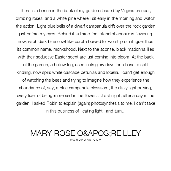 There is a bench in the back of my garden shaded by Virginia creeper, climbing roses, and a white pine where I sit early in the morning and watch the action. Light blue bells of a dwarf campanula drift over the rock garden just before my eyes. Behind it, a three-foot stand of aconite is flowering now, each dark blue cowl-like corolla bowed for worship or intrigue: thus its common name, monkshood. Next to the aconite, black madonna lilies with their seductive Easter scent are just coming into bloom. At the back of the garden, a hollow log, used in its glory days for a base to split kindling, now spills white cascade petunias and lobelia. I can't get enough of watching the bees and trying to imagine how they experience the abundance of, say, a blue campanula blosssom, the dizzy light pulsing, every fiber of being immersed in the flower. ...Last night, after a day in the garden, I asked Robin to explain (again) photosynthesis to me. I can't take in this business of _eating light_ and turning it into stem and thorn and flower...I would not call this meditation, sitting in the back garden. Maybe I would call it eating light. Mystical traditions recognize two kinds of practice: _apophatic mysticism_, which is the dark surrender of Zen, the Via Negativa of John of the Cross, and _kataphatic mysticism_, less well defined: an openhearted surrender to the beauty of creation. Maybe Francis of Assissi was, on the whole, a kataphatic mystic, as was Thérèse of Lisieux in her exuberant momemnts: but the fact is, kataphatic mysticism has low status in religious circles. Francis and Thérèse were made, really made, any mother superior will let you know, in the dark nights of their lives: no more of this throwing off your clothes and singing songs and babbling about the shelter of God's arms.When I was twelve and had my first menstrual period, my grandmother took me aside and said, 'Now your childhood is over. You will never really be happy again.' That is pretty much how some spiritual directors treat the transition from kataphatic to apophatic mysticism.But, I'm sorry, I'm going to sit here every day the sun shines and eat this light. Hung in the bell of desire