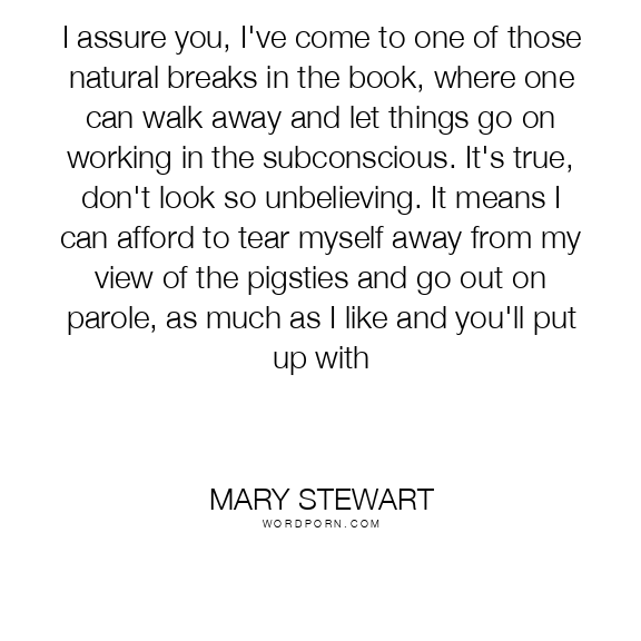 Mary Stewart quote. I assure you, I've come to one of those natural breaks in the book, where one can walk away and let things go on working in the subconscious. It's true, don't look so unbelieving. It means I can afford to tear myself away from my view of the pigsties and go out on parole, as much as I like and you'll put up with