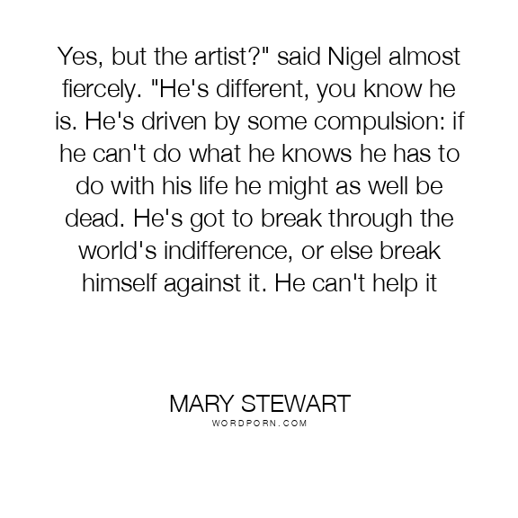 Yes, but the artist?" said Nigel almost fiercely. "He's different, you know he is. He's driven by some compulsion: if he can't do what he knows he has to do with his life he might as well be dead. He's got to break through the world's indifference, or else break himself against it. He can't help it