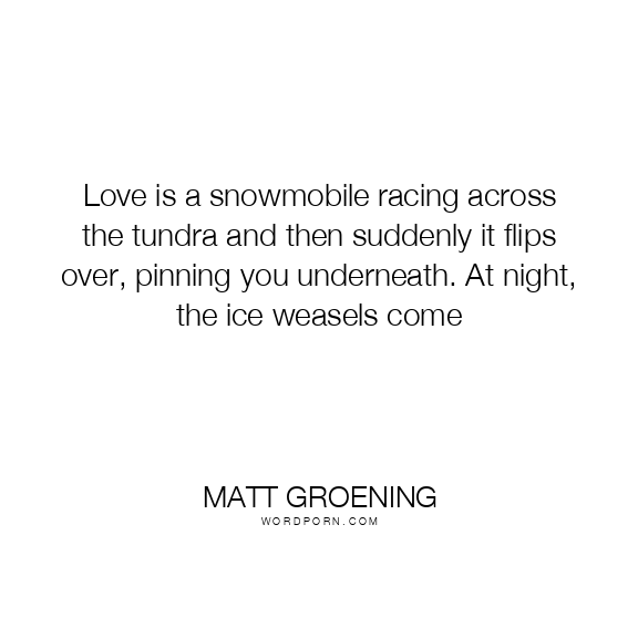 Copy Image Love is a snowmobile racing across the tundra and then suddenly it flips over, pinning you underneath. At night, the ice weasels come Moms Typewriter A A SAVE THIS IMAGE