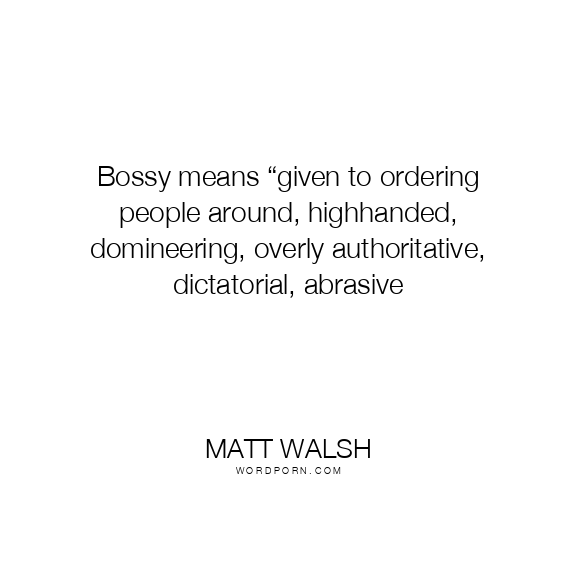 Bossy means “given to ordering people around, highhanded, domineering, overly authoritative, dictatorial, abrasive
