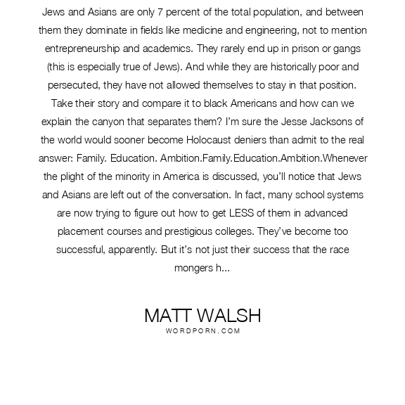 Jews and Asians are only 7 percent of the total population, and between them they dominate in fields like medicine and engineering, not to mention entrepreneurship and academics. They rarely end up in prison or gangs (this is especially true of Jews). And while they are historically poor and persecuted, they have not allowed themselves to stay in that position. Take their story and compare it to black Americans and how can we explain the canyon that separates them? I’m sure the Jesse Jacksons of the world would sooner become Holocaust deniers than admit to the real answer: Family. Education. Ambition.Family.Education.Ambition.Whenever the plight of the minority in America is discussed, you’ll notice that Jews and Asians are left out of the conversation. In fact, many school systems are now trying to figure out how to get LESS of them in advanced placement courses and prestigious colleges. They’ve become too successful, apparently. But it’s not just their success that the race mongers hate, it’s HOW they accomplished it. Their men don’t father dozens of out-of-wedlock babies with dozens of women. Their households insist on discipline and academic success. They work hard, they are driven. Asians may now be at the point where they actually enjoy preferential bias. If I’m an employer and an Asian walks in to apply for a job, I’m going to assume he’s an achiever. That’s not a stereotype, that’s called a reputation. And they’ve freaking earned it.Family. Education. Ambition. These three things really are a recipe for success. If you don’t believe me, ask the next Asian or Jew you meet. And then make sure to take care of your co-pay on the way out