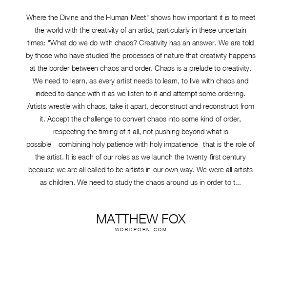 Where the Divine and the Human Meet" shows how important it is to meet the world with the creativity of an artist, particularly in these uncertain times: "What do we do with chaos? Creativity has an answer. We are told by those who have studied the processes of nature that creativity happens at the border between chaos and order. Chaos is a prelude to creativity. We need to learn, as every artist needs to learn, to live with chaos and indeed to dance with it as we listen to it and attempt some ordering. Artists wrestle with chaos, take it apart, deconstruct and reconstruct from it. Accept the challenge to convert chaos into some kind of order, respecting the timing of it all, not pushing beyond what is possible—combining holy patience with holy impatience--that is the role of the artist. It is each of our roles as we launch the twenty-first century because we are all called to be artists in our own way. We were all artists as children. We need to study the chaos around us in order to turn it into something beautiful. Something sustainable. Something that remains"