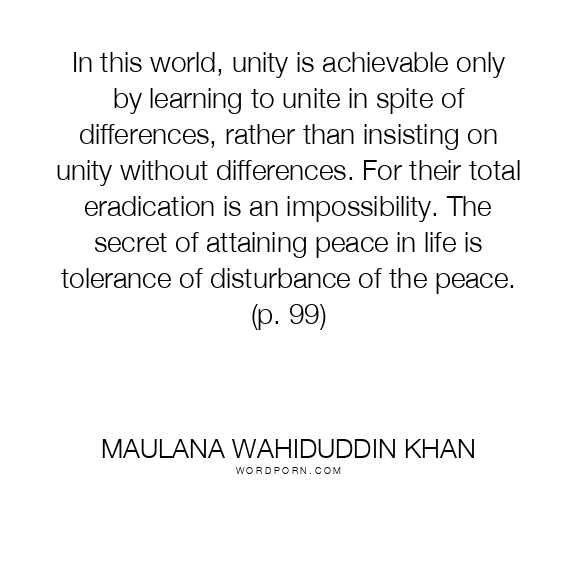 In this world, unity is achievable only by learning to unite in spite of differences, rather than insisting on unity without differences. For their total eradication is an impossibility. The secret of attaining peace in life is tolerance of disturbance of the peace. (p. 99)