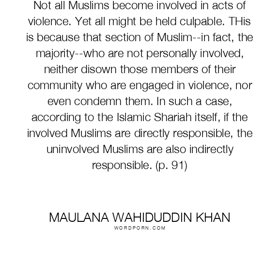 Not all Muslims become involved in acts of violence. Yet all might be held culpable. THis is because that section of Muslim--in fact, the majority--who are not personally involved, neither disown those members of their community who are engaged in violence, nor even condemn them. In such a case, according to the Islamic Shariah itself, if the involved Muslims are directly responsible, the uninvolved Muslims are also indirectly responsible. (p. 91)