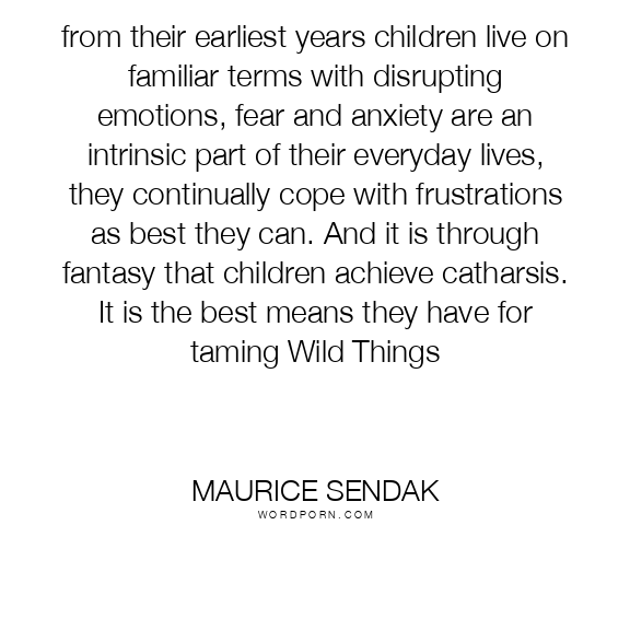 from their earliest years children live on familiar terms with disrupting emotions, fear and anxiety are an intrinsic part of their everyday lives, they continually cope with frustrations as best they can. And it is through fantasy that children achieve catharsis. It is the best means they have for taming Wild Things