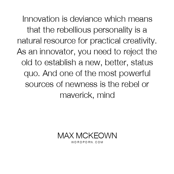 Innovation is deviance which means that the rebellious personality is a natural resource for practical creativity. As an innovator, you need to reject the old to establish a new, better, status quo. And one of the most powerful sources of newness is the rebel or maverick, mind