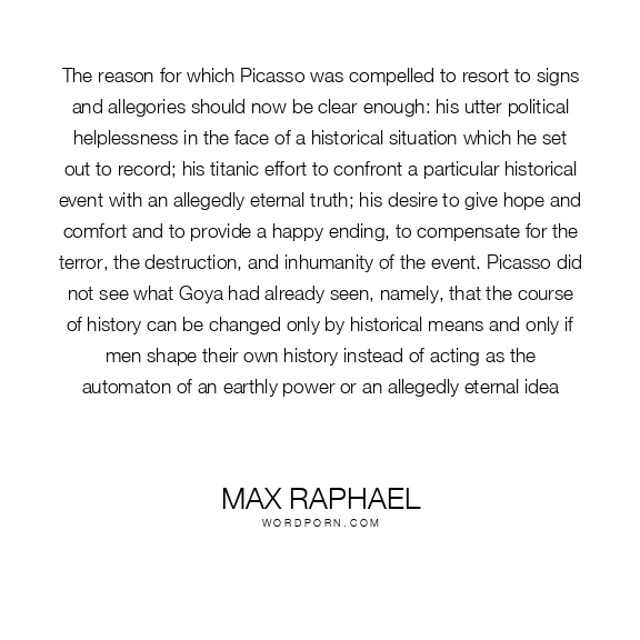 The reason for which Picasso was compelled to resort to signs and allegories should now be clear enough: his utter political helplessness in the face of a historical situation which he set out to record; his titanic effort to confront a particular historical event with an allegedly eternal truth; his desire to give hope and comfort and to provide a happy ending, to compensate for the terror, the destruction, and inhumanity of the event. Picasso did not see what Goya had already seen, namely, that the course of history can be changed only by historical means and only if men shape their own history instead of acting as the automaton of an earthly power or an allegedly eternal idea