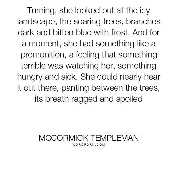 Turning, she looked out at the icy landscape, the soaring trees, branches dark and bitten blue with frost. And for a moment, she had something like a premonition, a feeling that something terrible was watching her, something hungry and sick. She could nearly hear it out there, panting between the trees, its breath ragged and spoiled