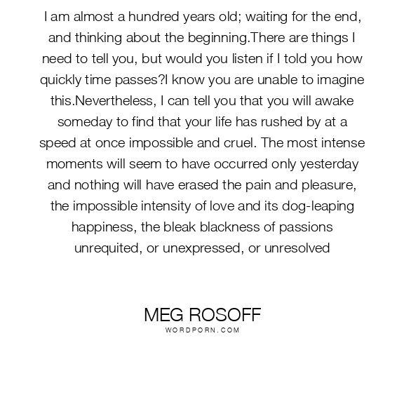 I am almost a hundred years old; waiting for the end, and thinking about the beginning.There are things I need to tell you, but would you listen if I told you how quickly time passes?I know you are unable to imagine this.Nevertheless, I can tell you that you will awake someday to find that your life has rushed by at a speed at once impossible and cruel. The most intense moments will seem to have occurred only yesterday and nothing will have erased the pain and pleasure, the impossible intensity of love and its dog-leaping happiness, the bleak blackness of passions unrequited, or unexpressed, or unresolved