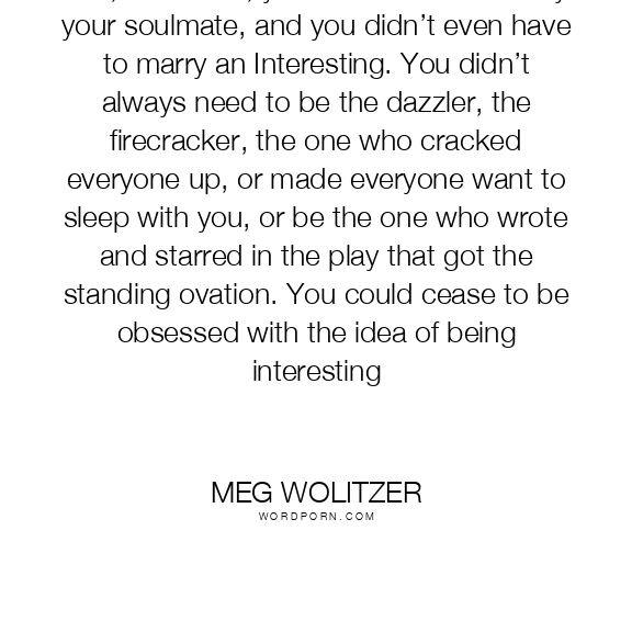 But, she knew, you didn’t have to marry your soulmate, and you didn’t even have to marry an Interesting. You didn’t always need to be the dazzler, the firecracker, the one who cracked everyone up, or made everyone want to sleep with you, or be the one who wrote and starred in the play that got the standing ovation. You could cease to be obsessed with the idea of being interesting