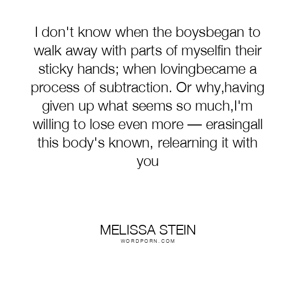I don't know when the boysbegan to walk away with parts of myselfin their sticky hands; when lovingbecame a process of subtraction. Or why,having given up what seems so much,I'm willing to lose even more — erasingall this body's known, relearning it with you