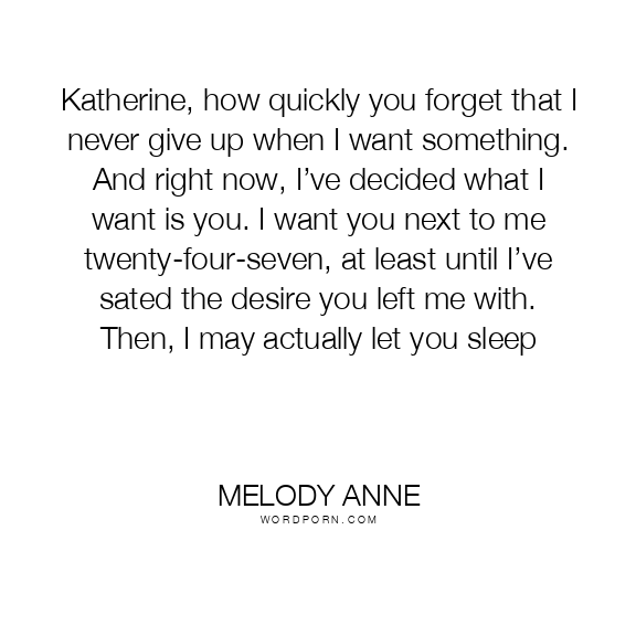 Katherine, how quickly you forget that I never give up when I want something. And right now, I’ve decided what I want is you. I want you next to me twenty-four-seven, at least until I’ve sated the desire you left me with. Then, I may actually let you sleep
