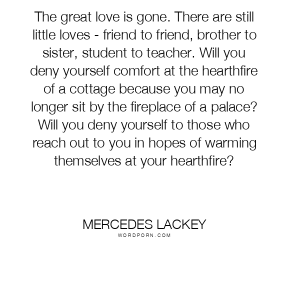 The great love is gone. There are still little loves - friend to friend, brother to sister, student to teacher. Will you deny yourself comfort at the hearthfire of a cottage because you may no longer sit by the fireplace of a palace? Will you deny yourself to those who reach out to you in hopes of warming themselves at your hearthfire?