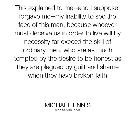 This explained to me--and I suppose, forgave me--my inability to see the face of this man, because whoever must deceive us in order to live will by necessity far exceed the skill of ordinary men, who are as much tempted by the desire to be honest as they are plagued by guilt and shame when they have broken faith