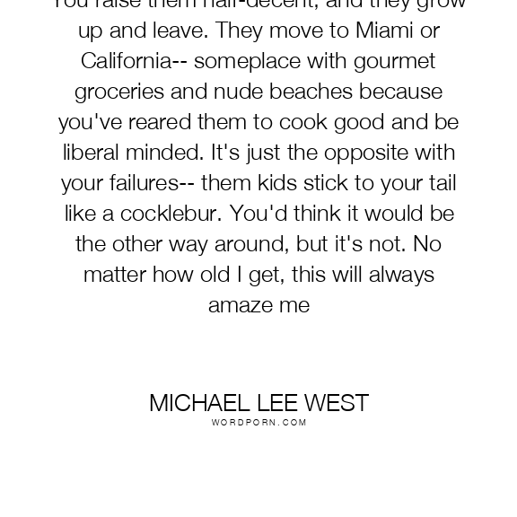 You raise them half-decent, and they grow up and leave. They move to Miami or California-- someplace with gourmet groceries and nude beaches because you've reared them to cook good and be liberal minded. It's just the opposite with your failures-- them kids stick to your tail like a cocklebur. You'd think it would be the other way around, but it's not. No matter how old I get, this will always amaze me