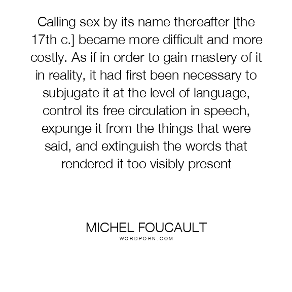 Calling sex by its name thereafter [the 17th c.] became more difficult and more costly. As if in order to gain mastery of it in reality, it had first been necessary to subjugate it at the level of language, control its free circulation in speech, expunge it from the things that were said, and extinguish the words that rendered it too visibly present