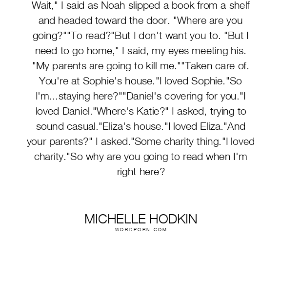 Wait," I said as Noah slipped a book from a shelf and headed toward the door. "Where are you going?""To read?"But I don't want you to. "But I need to go home," I said, my eyes meeting his. "My parents are going to kill me.""Taken care of. You're at Sophie's house."I loved Sophie."So I'm...staying here?""Daniel's covering for you."I loved Daniel."Where's Katie?" I asked, trying to sound casual."Eliza's house."I loved Eliza."And your parents?" I asked."Some charity thing."I loved charity."So why are you going to read when I'm right here?