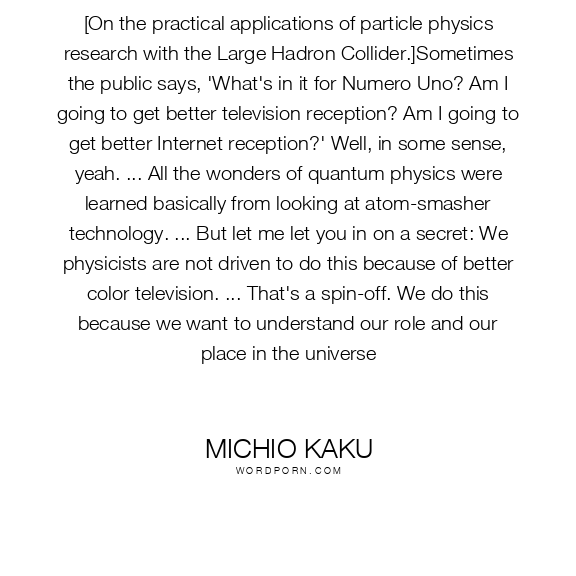 Michio Kaku quote. [On the practical applications of particle physics research with the Large Hadron Collider.]Sometimes the public says, 'What's in it for Numero Uno? Am I going to get better television reception? Am I going to get better Internet reception?' Well, in some sense, yeah. ... All the wonders of quantum physics were learned basically from looking at atom-smasher technology. ... But let me let you in on a secret: We physicists are not driven to do this because of better color television. ... That's a spin-off. We do this because we want to understand our role and our place in the universe