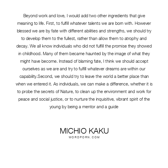 Michio Kaku quote. Beyond work and love, I would add two other ingredients that give meaning to life. First, to fulfill whatever talents we are born with. However blessed we are by fate with different abilities and strengths, we should try to develop them to the fullest, rather than allow them to atrophy and decay. We all know individuals who did not fulfill the promise they showed in childhood. Many of them became haunted by the image of what they might have become. Instead of blaming fate, I think we should accept ourselves as we are and try to fulfill whatever dreams are within our capability.Second, we should try to leave the world a better place than when we entered it. As individuals, we can make a difference, whether it is to probe the secrets of Nature, to clean up the environment and work for peace and social justice, or to nurture the inquisitive, vibrant spirit of the young by being a mentor and a guide