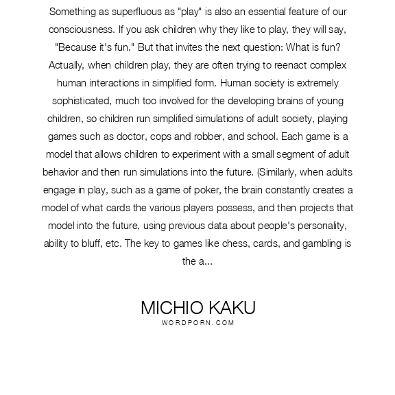 Something as superfluous as "play" is also an essential feature of our consciousness. If you ask children why they like to play, they will say, "Because it's fun." But that invites the next question: What is fun? Actually, when children play, they are often trying to reenact complex human interactions in simplified form. Human society is extremely sophisticated, much too involved for the developing brains of young children, so children run simplified simulations of adult society, playing games such as doctor, cops and robber, and school. Each game is a model that allows children to experiment with a small segment of adult behavior and then run simulations into the future. (Similarly, when adults engage in play, such as a game of poker, the brain constantly creates a model of what cards the various players possess, and then projects that model into the future, using previous data about people's personality, ability to bluff, etc. The key to games like chess, cards, and gambling is the ability to simulate the future. Animals, which live largely in the present, are not as good at games as humans are, especially if they involve planning. Infant mammals do engage in a form of play, but this is more for exercise, testing one another, practicing future battles, and establishing the coming social pecking order rather than simulating the future.)