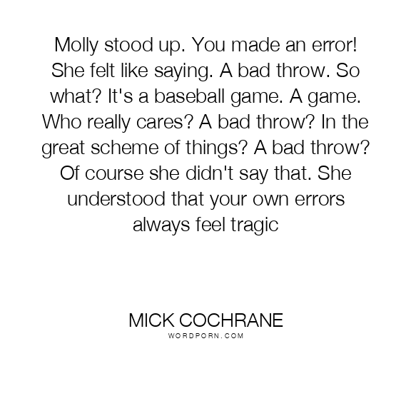 Molly stood up. You made an error! She felt like saying. A bad throw. So what? It's a baseball game. A game. Who really cares? A bad throw? In the great scheme of things? A bad throw? Of course she didn't say that. She understood that your own errors always feel tragic