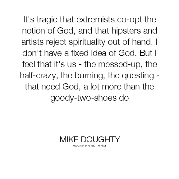 It's tragic that extremists co-opt the notion of God, and that hipsters and artists reject spirituality out of hand. I don't have a fixed idea of God. But I feel that it's us - the messed-up, the half-crazy, the burning, the questing - that need God, a lot more than the goody-two-shoes do