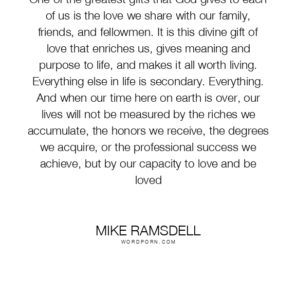 One of the greatest gifts that God gives to each of us is the love we share with our family, friends, and fellowmen. It is this divine gift of love that enriches us, gives meaning and purpose to life, and makes it all worth living. Everything else in life is secondary. Everything. And when our time here on earth is over, our lives will not be measured by the riches we accumulate, the honors we receive, the degrees we acquire, or the professional success we achieve, but by our capacity to love and be loved