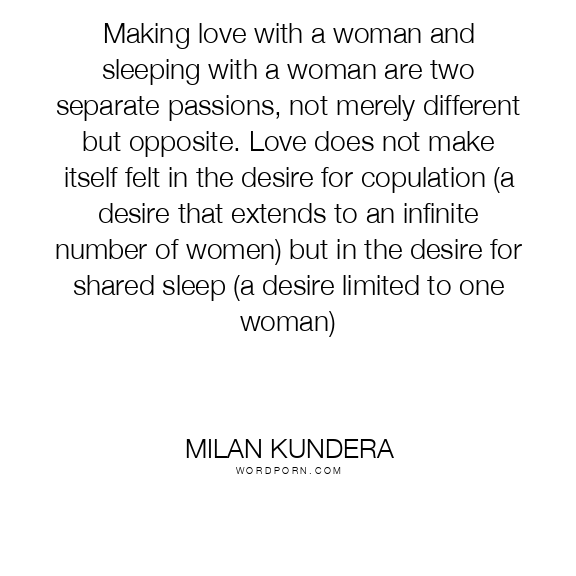 Making love with a woman and sleeping with a woman are two separate passions, not merely different but opposite. Love does not make itself felt in the desire for copulation (a desire that extends to an infinite number of women) but in the desire for shared sleep (a desire limited to one woman)