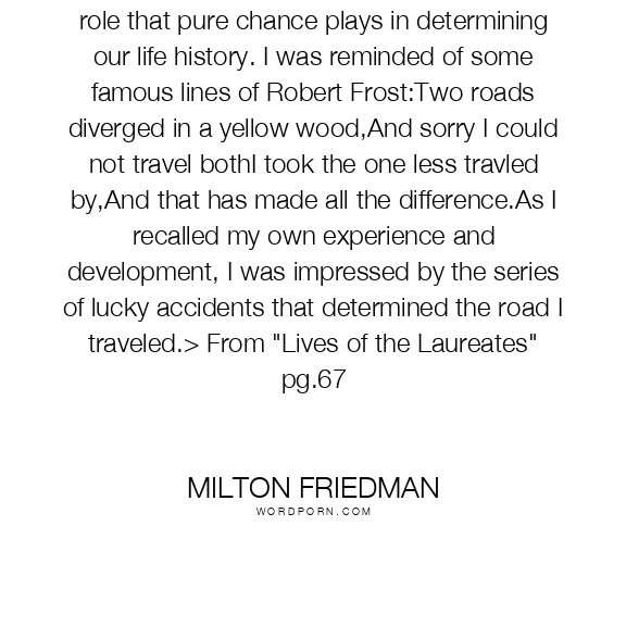 I have been enormously impressed by the role that pure chance plays in determining our life history. I was reminded of some famous lines of Robert Frost:Two roads diverged in a yellow wood,And sorry I could not travel bothI took the one less travled by,And that has made all the difference.As I recalled my own experience and development, I was impressed by the series of lucky accidents that determined the road I traveled.> From "Lives of the Laureates" pg.67