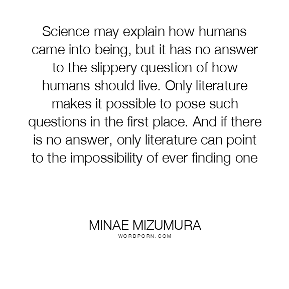 Minae Mizumura quote. Science may explain how humans came into being, but it has no answer to the slippery question of how humans should live. Only literature makes it possible to pose such questions in the first place. And if there is no answer, only literature can point to the impossibility of ever finding one