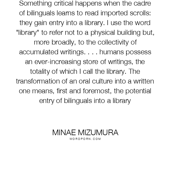 Minae Mizumura quote. Something critical happens when the cadre of bilinguals learns to read imported scrolls: they gain entry into a library. I use the word