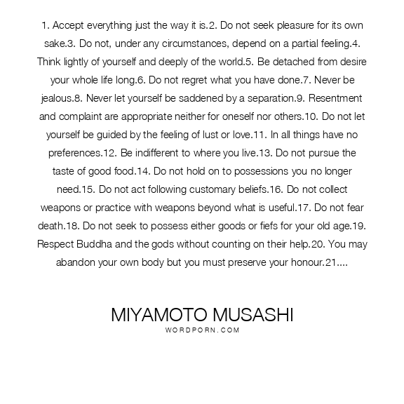 1. Accept everything just the way it is.2. Do not seek pleasure for its own sake.3. Do not, under any circumstances, depend on a partial feeling.4. Think lightly of yourself and deeply of the world.5. Be detached from desire your whole life long.6. Do not regret what you have done.7. Never be jealous.8. Never let yourself be saddened by a separation.9. Resentment and complaint are appropriate neither for oneself nor others.10. Do not let yourself be guided by the feeling of lust or love.11. In all things have no preferences.12. Be indifferent to where you live.13. Do not pursue the taste of good food.14. Do not hold on to possessions you no longer need.15. Do not act following customary beliefs.16. Do not collect weapons or practice with weapons beyond what is useful.17. Do not fear death.18. Do not seek to possess either goods or fiefs for your old age.19. Respect Buddha and the gods without counting on their help.20. You may abandon your own body but you must preserve your honour.21. Never stray from the Way