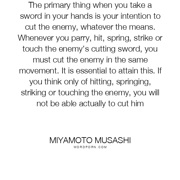 The primary thing when you take a sword in your hands is your intention to cut the enemy, whatever the means. Whenever you parry, hit, spring, strike or touch the enemy's cutting sword, you must cut the enemy in the same movement. It is essential to attain this. If you think only of hitting, springing, striking or touching the enemy, you will not be able actually to cut him