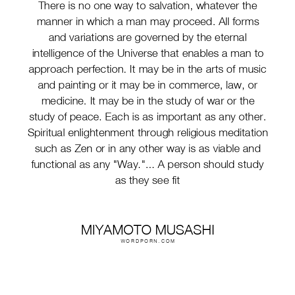 There is no one way to salvation, whatever the manner in which a man may proceed. All forms and variations are governed by the eternal intelligence of the Universe that enables a man to approach perfection. It may be in the arts of music and painting or it may be in commerce, law, or medicine. It may be in the study of war or the study of peace. Each is as important as any other. Spiritual enlightenment through religious meditation such as Zen or in any other way is as viable and functional as any "Way."... A person should study as they see fit