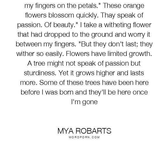 Most girls prefer flowers over trees.' I brush my fingers on the petals." These orange flowers blossom quickly. Thay speak of passion. Of beauty." I take a witheting flower that had dropped to the ground and worry it between my fingers. "But they don't last; they wither so easily. Flowers have limited growth. A tree might not speak of passion but sturdiness. Yet it grows higher and lasts more. Some of these trees have been here before I was born and they'll be here once I'm gone