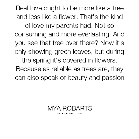 Real love ought to be more like a tree and less like a flower. That's the kind of love my parents had. Not so consuming and more everlasting. And you see that tree over there? Now it's only showing green leaves, but during the spring it's covered in flowers. Because as reliable as trees are, they can also speak of beauty and passion