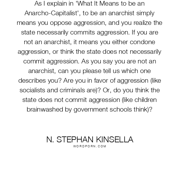 As I explain in 'What It Means to be an Anarcho-Capitalist', to be an anarchist simply means you oppose aggression, and you realize the state necessarily commits aggression. If you are not an anarchist, it means you either condone aggression, or think the state does not necessarily commit aggression. As you say you are not an anarchist, can you please tell us which one describes you? Are you in favor of aggression (like socialists and criminals are)? Or, do you think the state does not commit aggression (like children brainwashed by government schools think)?