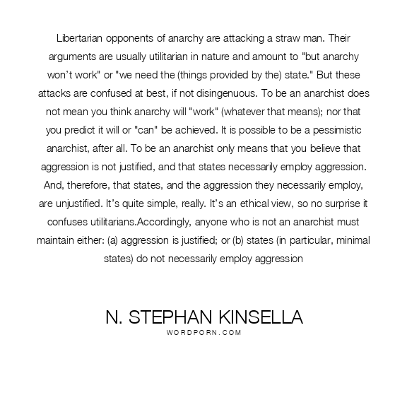 Libertarian opponents of anarchy are attacking a straw man. Their arguments are usually utilitarian in nature and amount to "but anarchy won’t work" or "we need the (things provided by the) state." But these attacks are confused at best, if not disingenuous. To be an anarchist does not mean you think anarchy will "work" (whatever that means); nor that you predict it will or "can" be achieved. It is possible to be a pessimistic anarchist, after all. To be an anarchist only means that you believe that aggression is not justified, and that states necessarily employ aggression. And, therefore, that states, and the aggression they necessarily employ, are unjustified. It’s quite simple, really. It’s an ethical view, so no surprise it confuses utilitarians.Accordingly, anyone who is not an anarchist must maintain either: (a) aggression is justified; or (b) states (in particular, minimal states) do not necessarily employ aggression