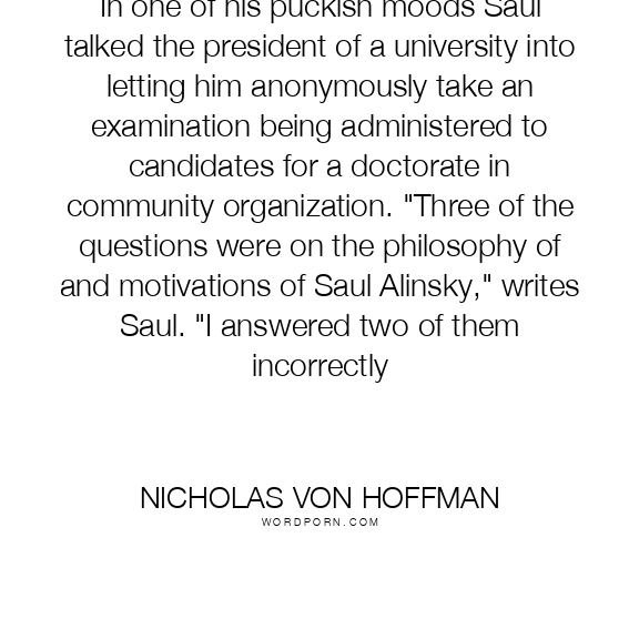 In one of his puckish moods Saul talked the president of a university into letting him anonymously take an examination being administered to candidates for a doctorate in community organization. "Three of the questions were on the philosophy of and motivations of Saul Alinsky," writes Saul. "I answered two of them incorrectly