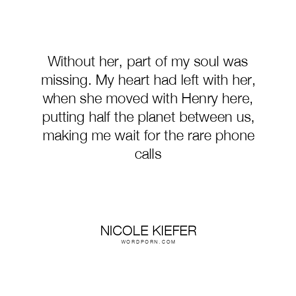 Without her, part of my soul was missing. My heart had left with her, when she moved with Henry here, putting half the planet between us, making me wait for the rare phone calls