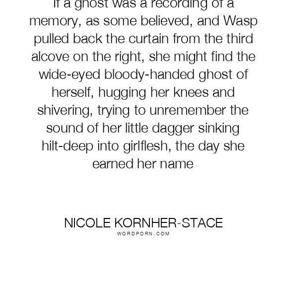 If a ghost was a recording of a memory, as some believed, and Wasp pulled back the curtain from the third alcove on the right, she might find the wide-eyed bloody-handed ghost of herself, hugging her knees and shivering, trying to unremember the sound of her little dagger sinking hilt-deep into girlflesh, the day she earned her name