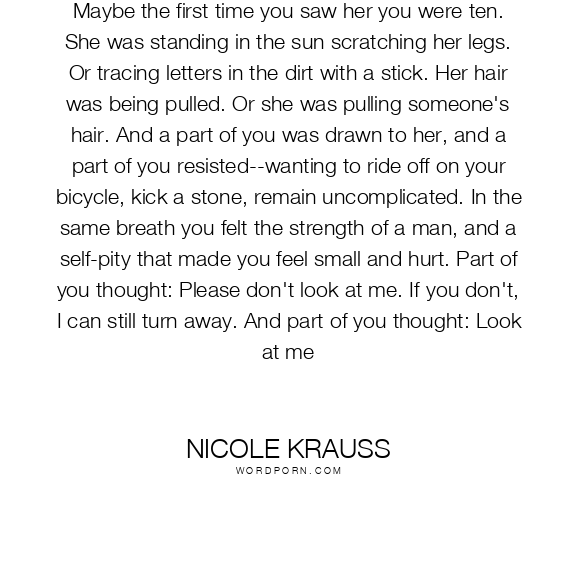 Maybe the first time you saw her you were ten. She was standing in the sun scratching her legs. Or tracing letters in the dirt with a stick. Her hair was being pulled. Or she was pulling someone's hair. And a part of you was drawn to her, and a part of you resisted--wanting to ride off on your bicycle, kick a stone, remain uncomplicated. In the same breath you felt the strength of a man, and a self-pity that made you feel small and hurt. Part of you thought: Please don't look at me. If you don't, I can still turn away. And part of you thought: Look at me