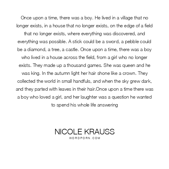 Once upon a time, there was a boy. He lived in a village that no longer exists, in a house that no longer exists, on the edge of a field that no longer exists, where everything was discovered, and everything was possible. A stick could be a sword, a pebble could be a diamond, a tree, a castle. Once upon a time, there was a boy who lived in a house across the field, from a girl who no longer exists. They made up a thousand games. She was queen and he was king. In the autumn light her hair shone like a crown. They collected the world in small handfuls, and when the sky grew dark, and they parted with leaves in their hair.Once upon a time there was a boy who loved a girl, and her laughter was a question he wanted to spend his whole life answering