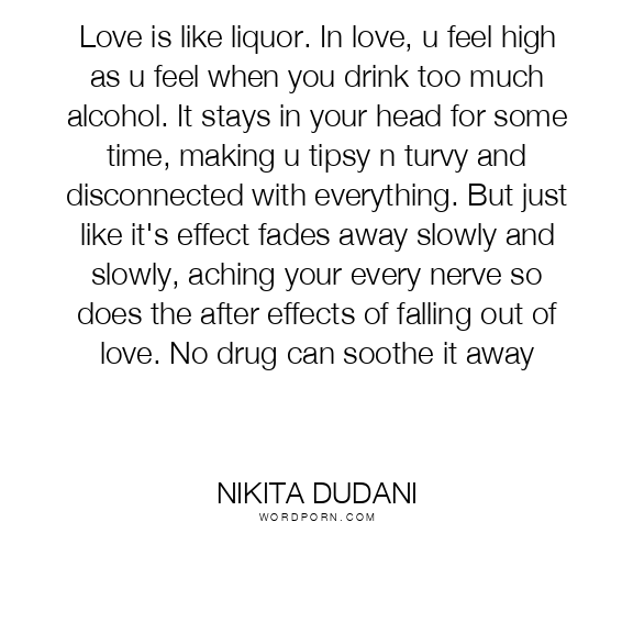 Love is like liquor. In love, u feel high as u feel when you drink too much alcohol. It stays in your head for some time, making u tipsy n turvy and disconnected with everything. But just like it's effect fades away slowly and slowly, aching your every nerve so does the after effects of falling out of love. No drug can soothe it away