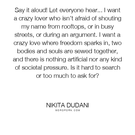 Say it aloud! Let everyone hear... I want a crazy lover who isn't afraid of shouting my name from rooftops, or in busy streets, or during an argument. I want a crazy love where freedom sparks in, two bodies and souls are sewed together, and there is nothing artificial nor any kind of societal pressure. Is it hard to search or too much to ask for?