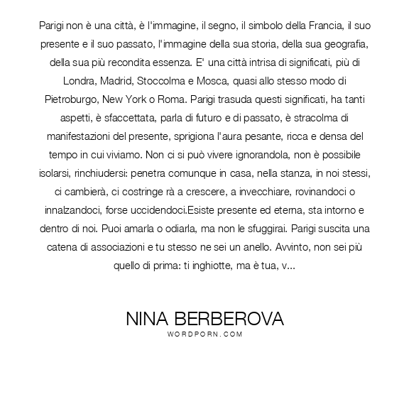 Parigi non è una città, è l'immagine, il segno, il simbolo della Francia, il suo presente e il suo passato, l'immagine della sua storia, della sua geografia, della sua più recondita essenza. E' una città intrisa di significati, più di Londra, Madrid, Stoccolma e Mosca, quasi allo stesso modo di Pietroburgo, New York o Roma. Parigi trasuda questi significati, ha tanti aspetti, è sfaccettata, parla di futuro e di passato, è stracolma di manifestazioni del presente, sprigiona l'aura pesante, ricca e densa del tempo in cui viviamo. Non ci si può vivere ignorandola, non è possibile isolarsi, rinchiudersi: penetra comunque in casa, nella stanza, in noi stessi, ci cambierà, ci costringe rà a crescere, a invecchiare, rovinandoci o innalzandoci, forse uccidendoci.Esiste presente ed eterna, sta intorno e dentro di noi. Puoi amarla o odiarla, ma non le sfuggirai. Parigi suscita una catena di associazioni e tu stesso ne sei un anello. Avvinto, non sei più quello di prima: ti inghiotte, ma è tua, vi siete mangiati a vicenda, ti scorre nel sangue