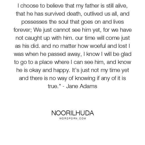 I choose to believe that my father is still alive, that he has survived death, outlived us all, and possesses the soul that goes on and lives forever; We just cannot see him yet, for we have not caught up with him. our time will come just as his did. and no matter how woeful and lost I was when he passed away, I know I will be glad to go to a place where I can see him, and know he is okay and happy. It’s just not my time yet and there is no way of knowing if any of it is true." - Jane Adams
